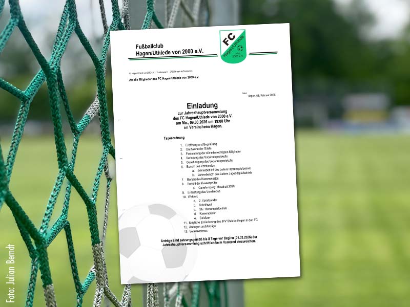 Der FC Hagen/Uthlede von 2000 e.V. lädt seine Mitglieder zur Jahreshauptversammlung am Montag, 09. März 2026, um 19:00 Uhr in das Vereinsheim des Hagener Sportvereins an der Blumenstraße ein.